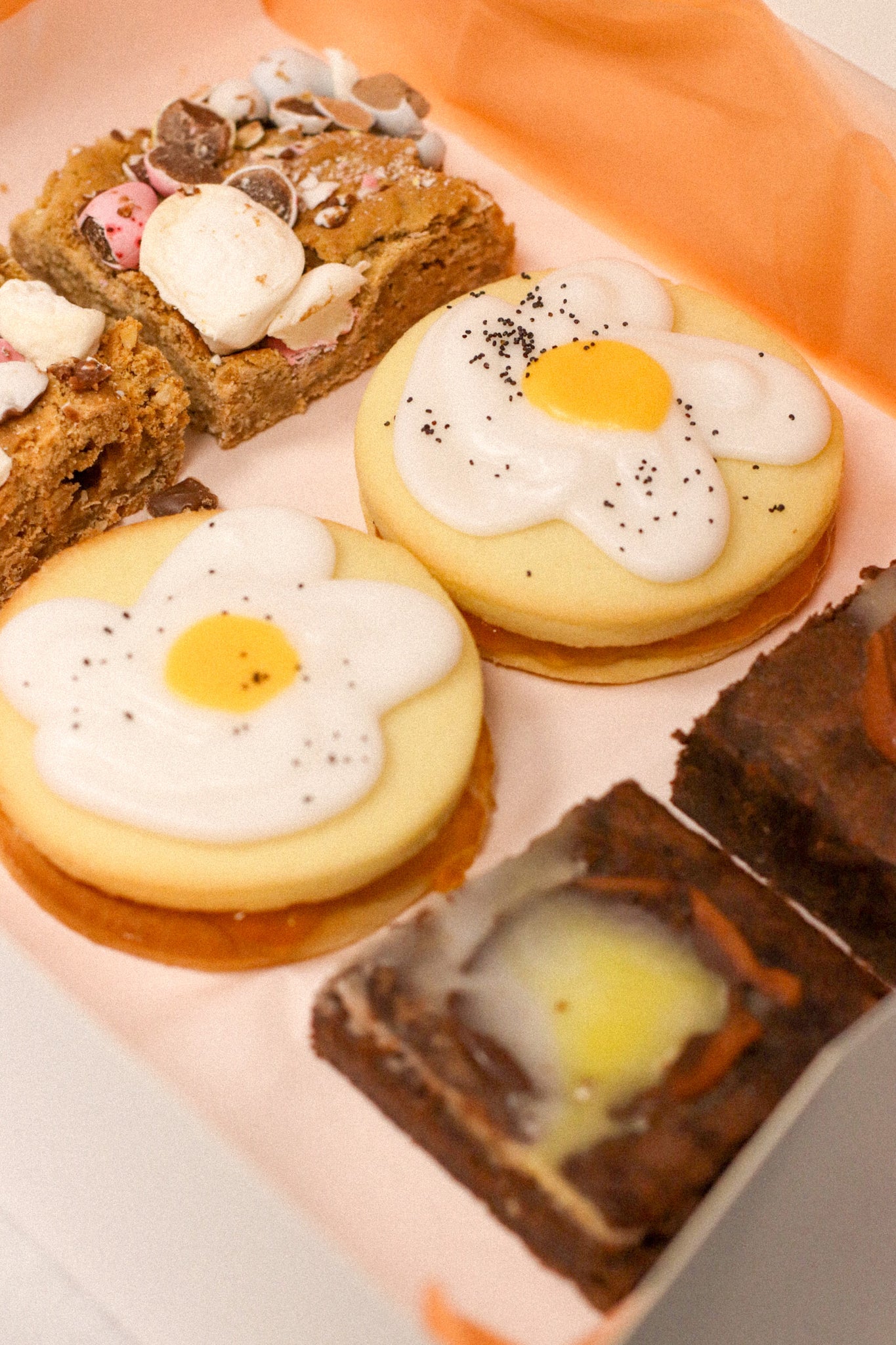 Egg-pire: vegan butter, vegan margarine, caster sugar, plain flour (gluten), apricot jam, icing sugar, water, poppyseeds, orange colouring.